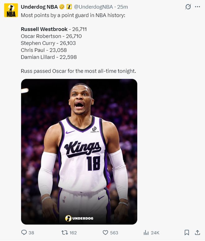 北京时间1月3日,国王102-129惨败太阳,这是一场毫无悬念的比赛,太阳一直牢牢掌控局势,末节更是一波32-19将国王按在地板上摩擦。37岁的威少这场比赛却迎来了里程碑的夜晚,他的历史总得分超过26711+超过大O,成为历史控卫得分王。